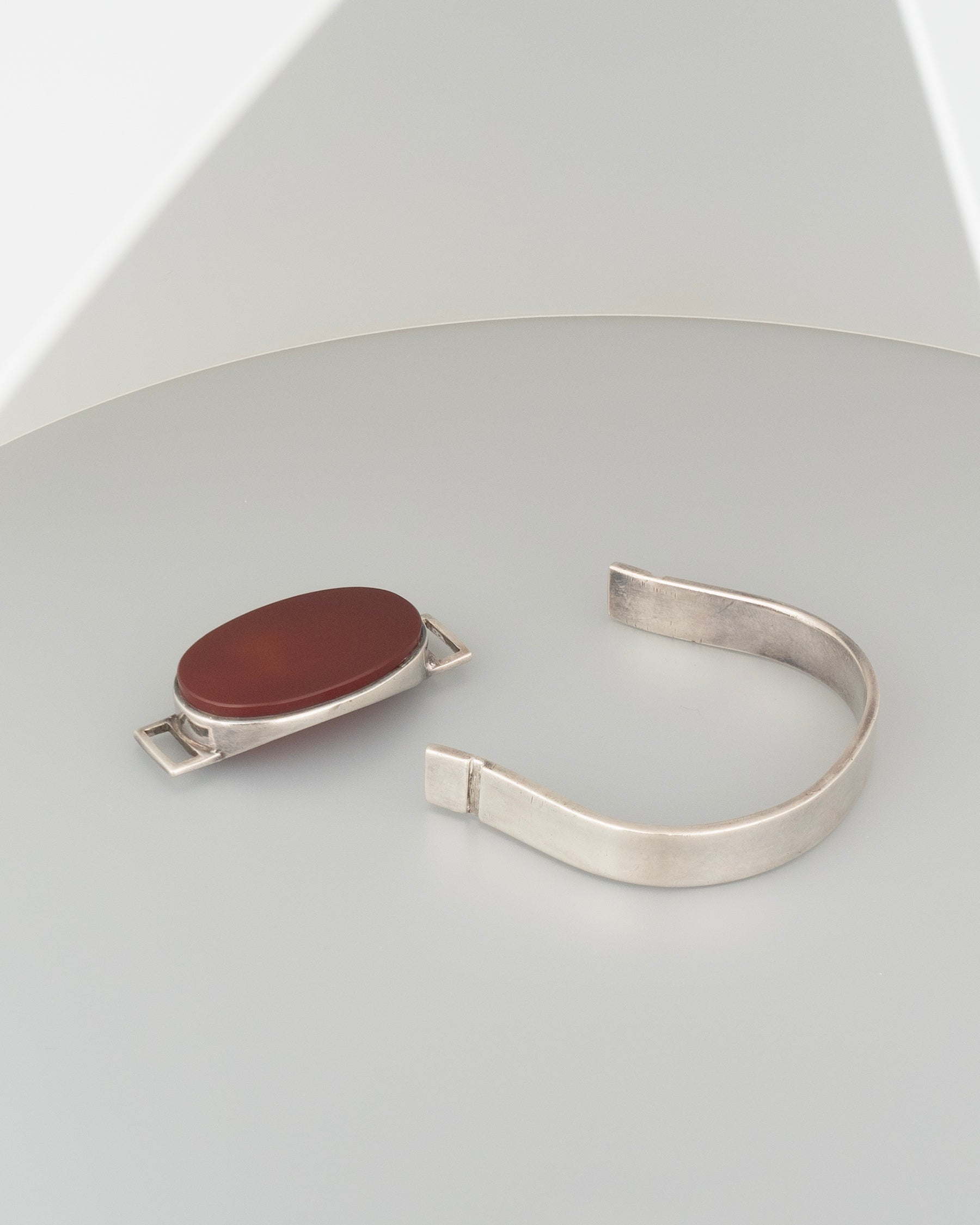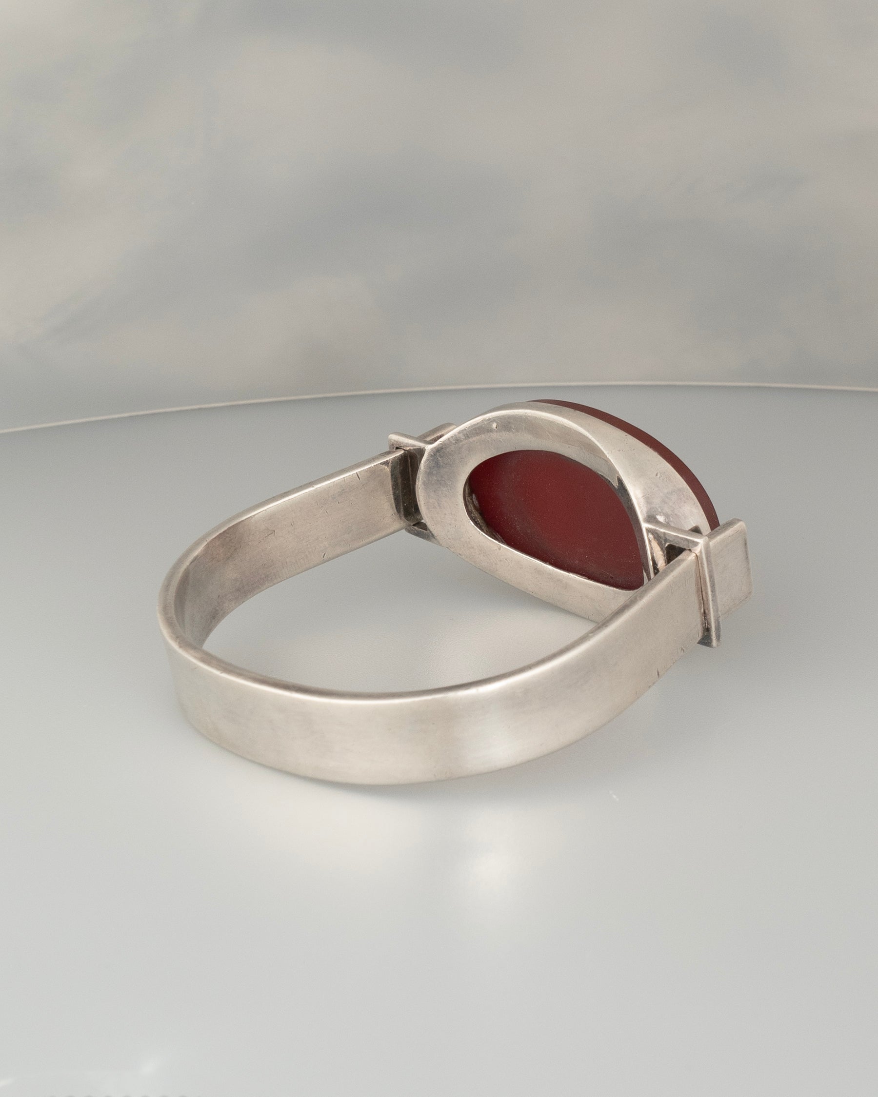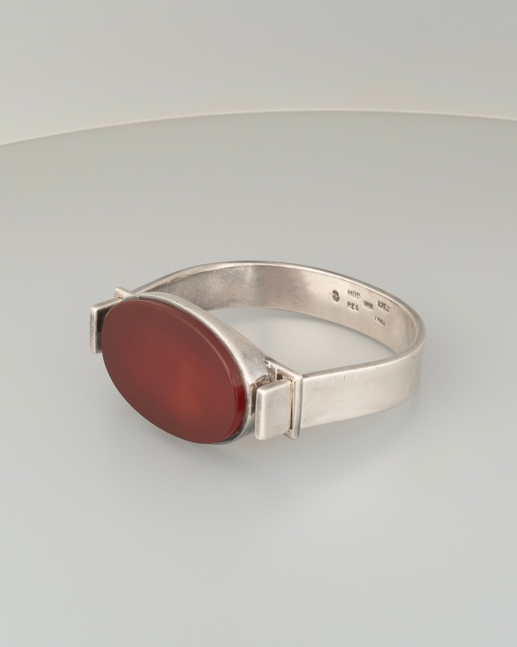 a Spanish modernist two part tension bangle in solid sterling silver and carnelian. a square edged solid and slabby cuff is notched to tension-host its comfort curved clean line topper featuring a vibrant slab of polished carnelian stone. S'Paliu for the stamp collectors.