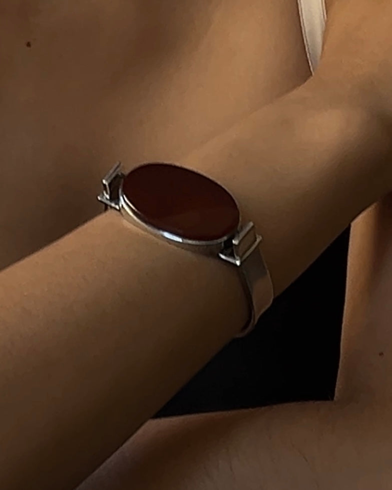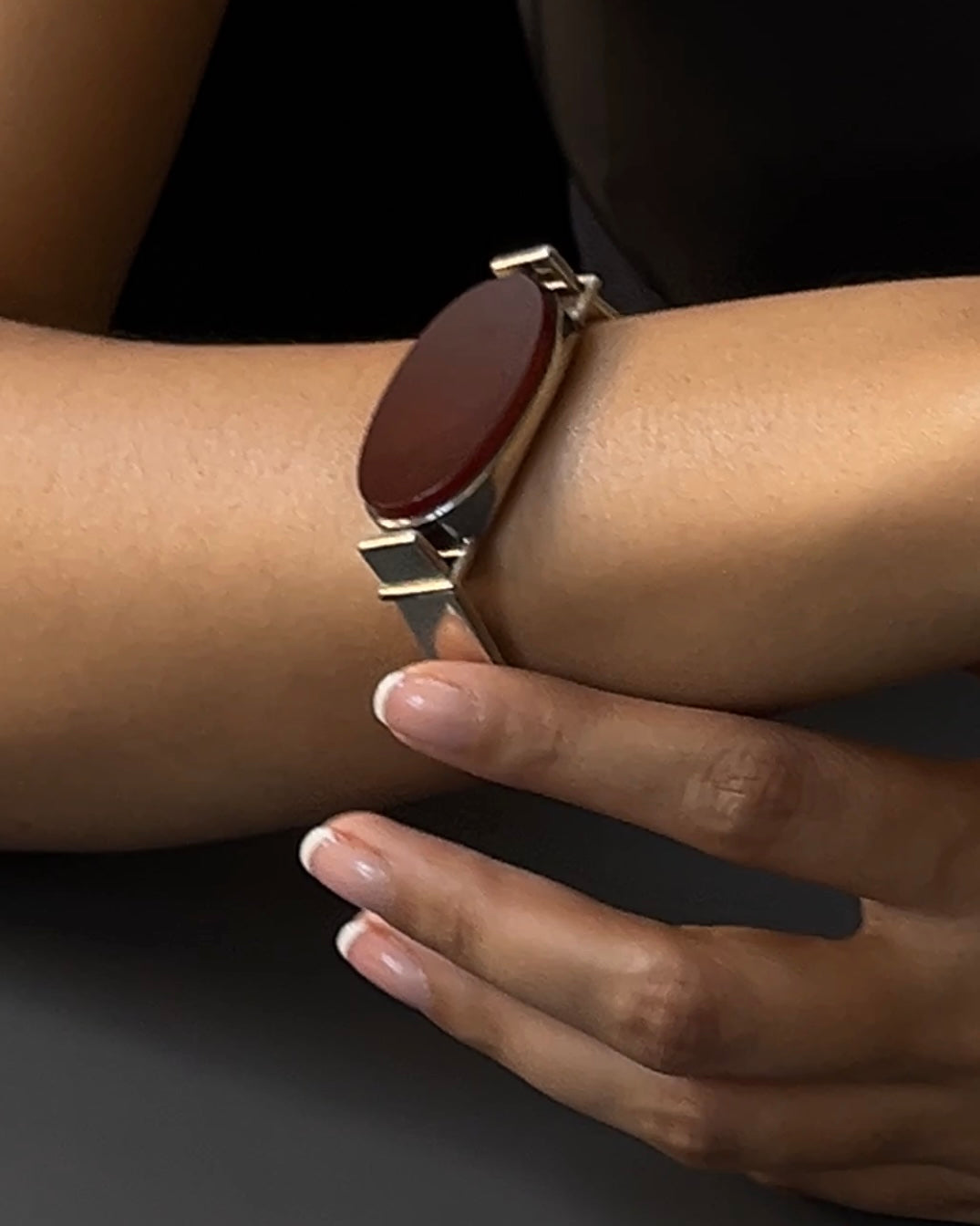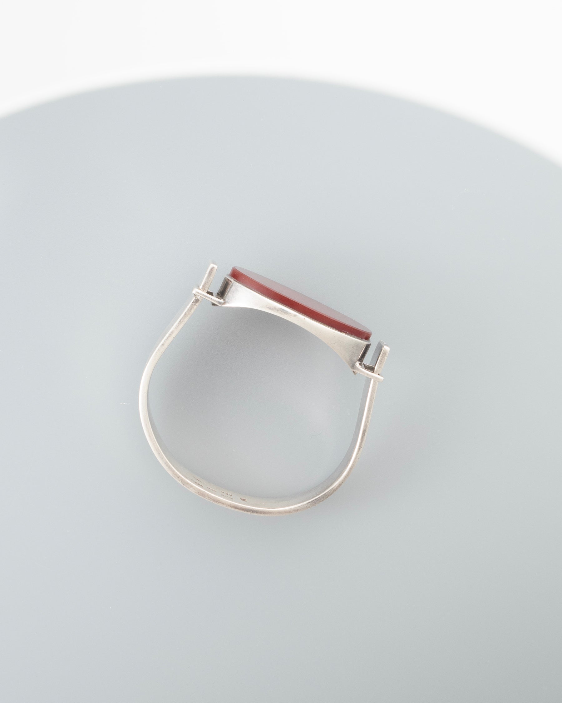 a Spanish modernist two part tension bangle in solid sterling silver and carnelian. a square edged solid and slabby cuff is notched to tension-host its comfort curved clean line topper featuring a vibrant slab of polished carnelian stone. S'Paliu for the stamp collectors.