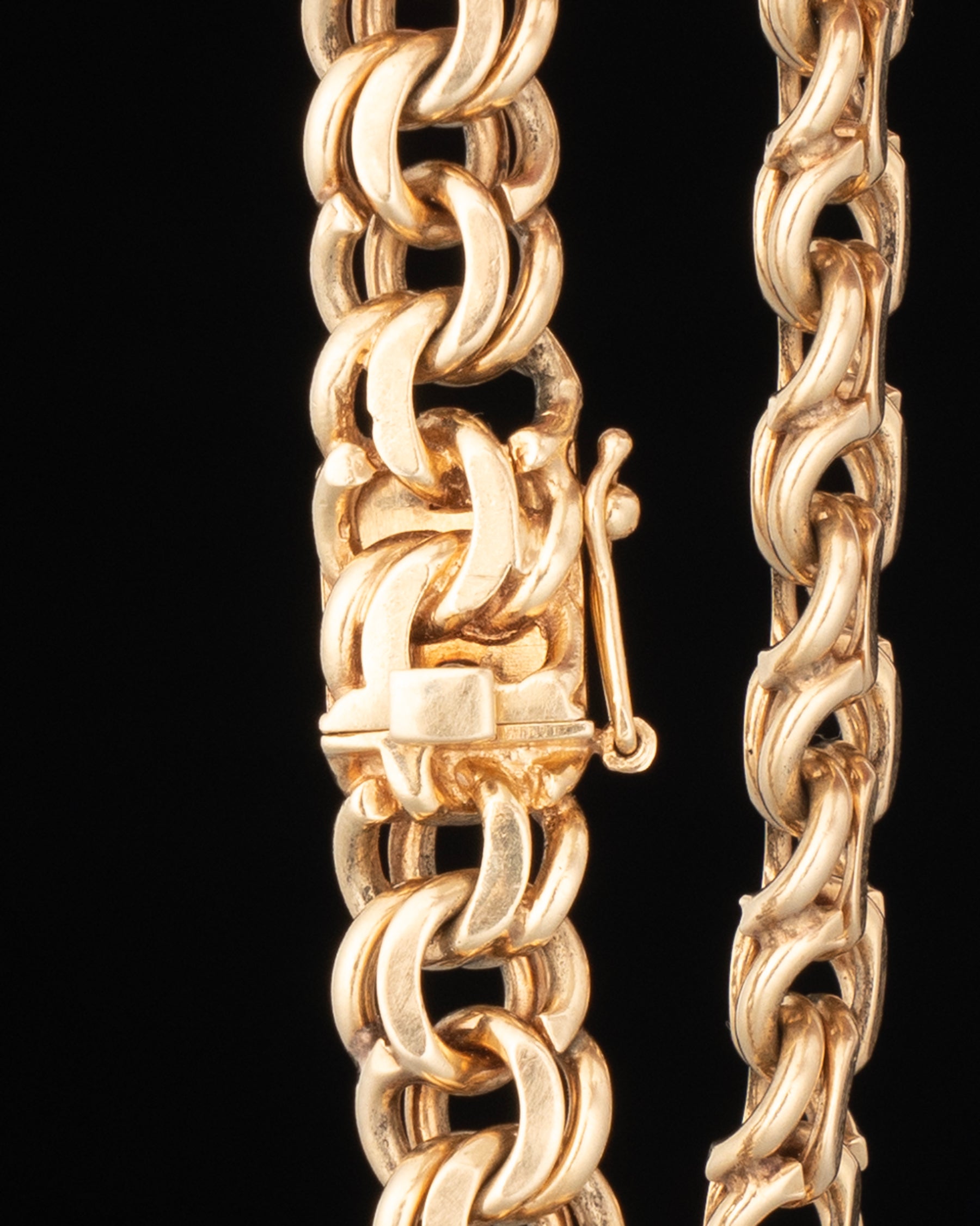 a solid and heavy artisan crafted rolled out double linked solid 14k gold chain with box clasp closure and figure eight safety catch.