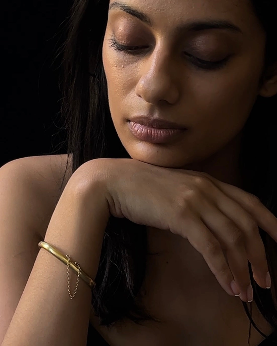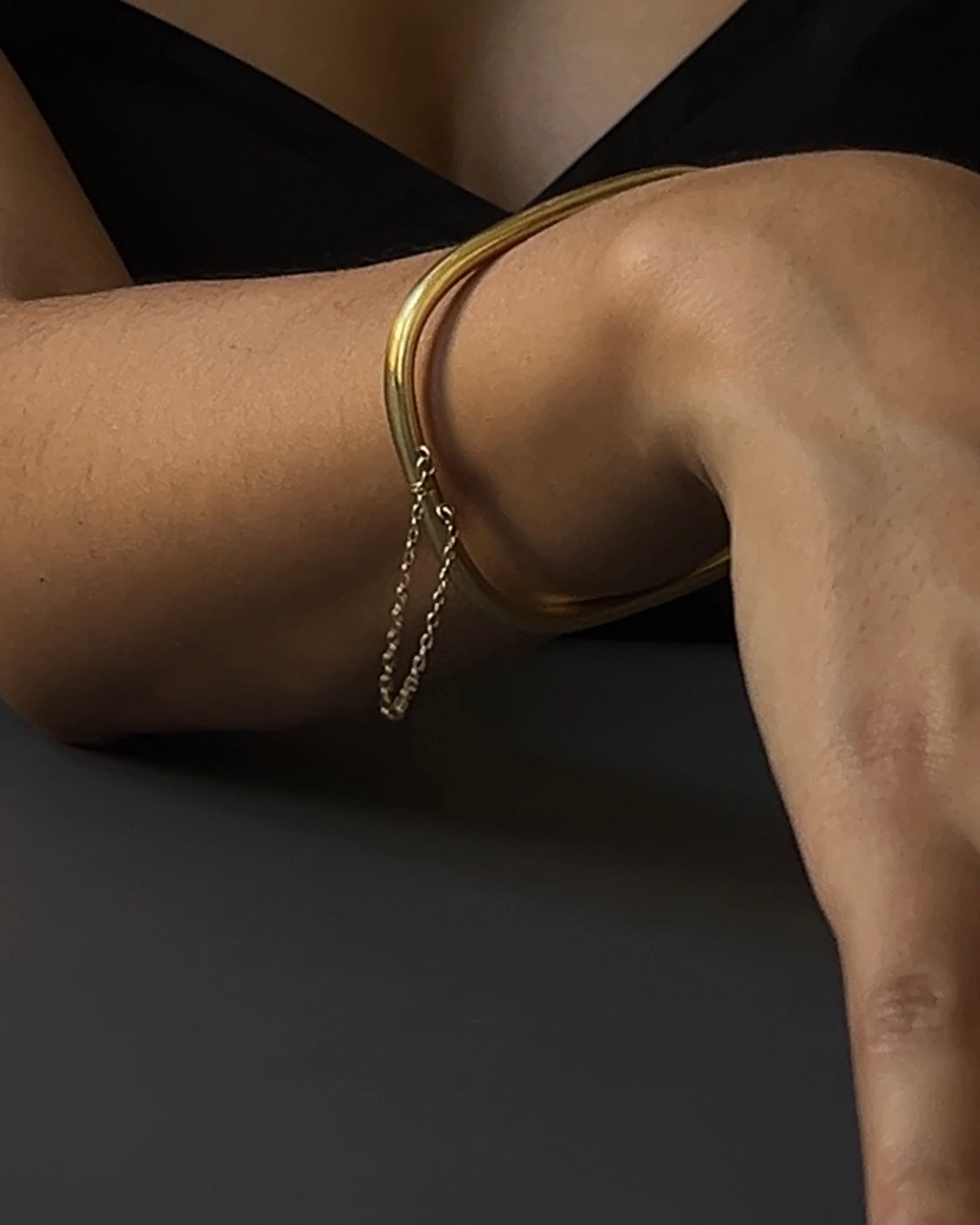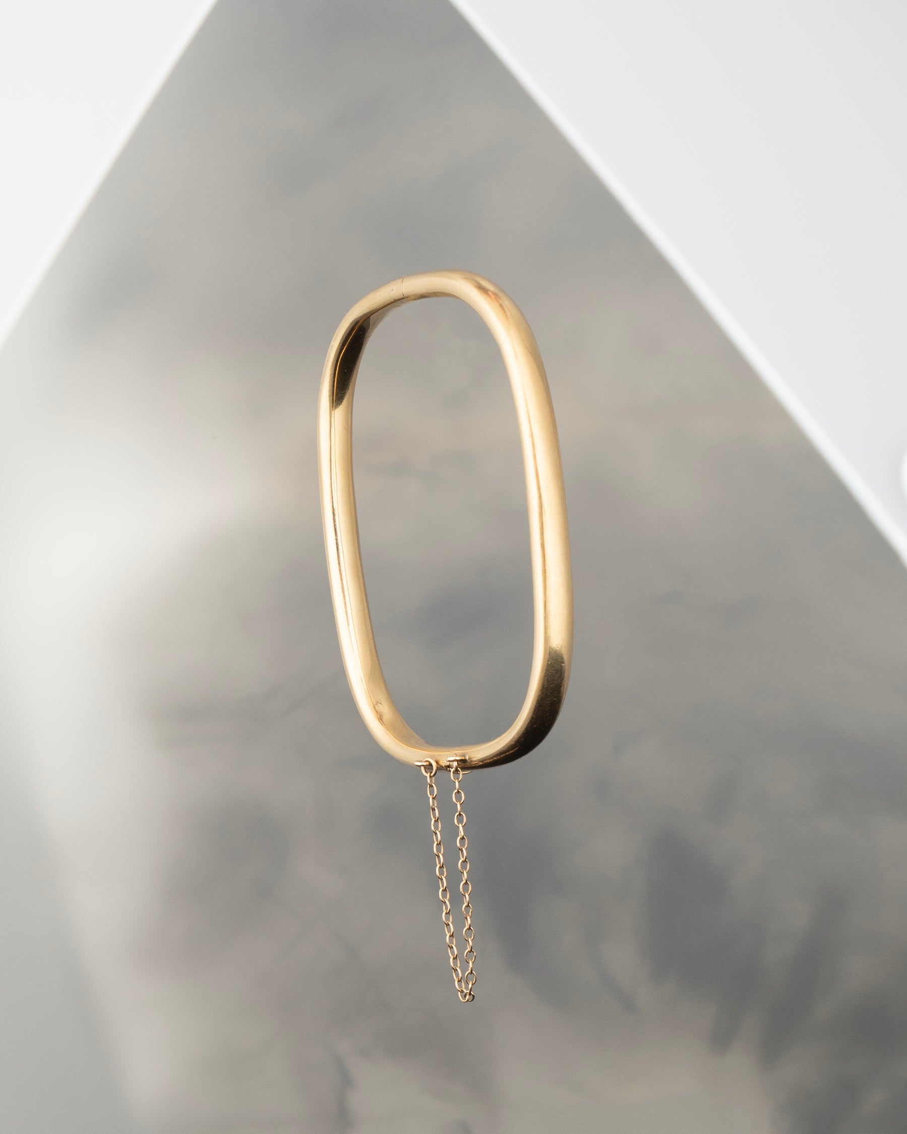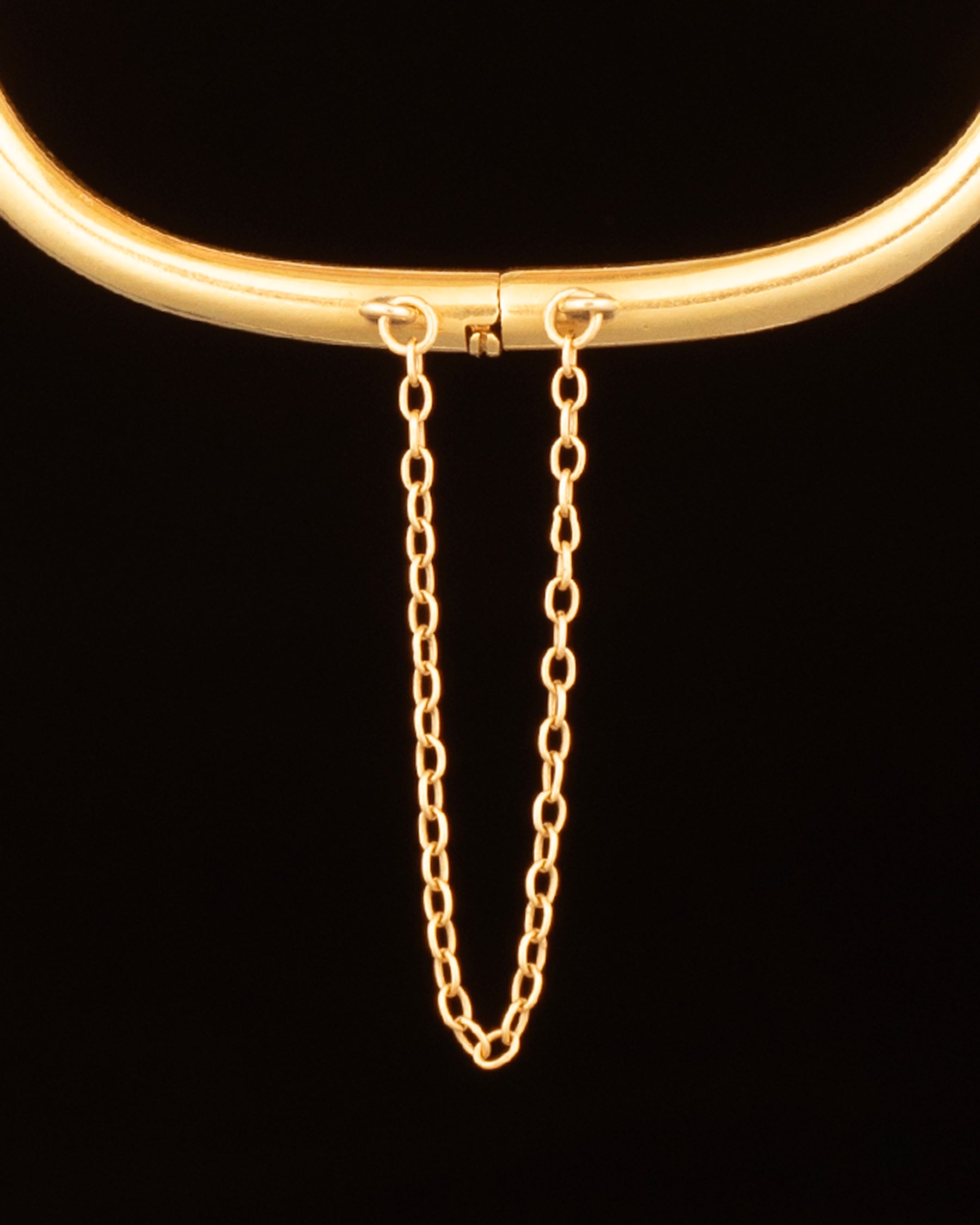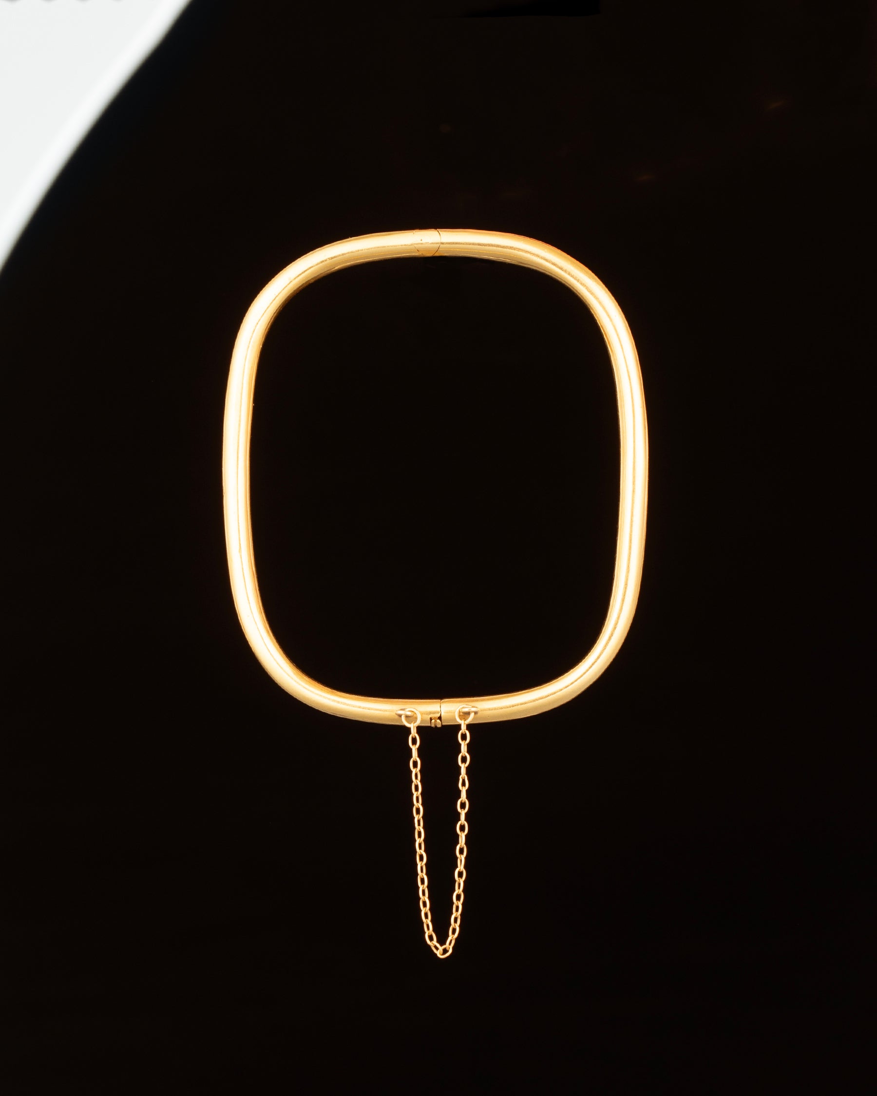 an impeccably crafted solid 18k yellow gold hinged soft rectangle bangle - two hollow round tube halves hinge together and securely close with a discreet channeled button box clasp with added safety chain.